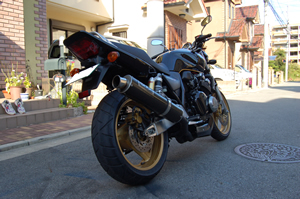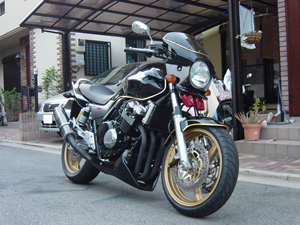 中免を取って一番最初の単車です。中学生の頃から、CBかっこええな〜って感じで、16になってすぐに免許を取りに行き、最初は金銭の問題で250にしようか迷っていたが、最終的に一番好きなCBにすることにした(笑)買ってまだ間もない相棒を貯金をはたいてレーシー仕様へと改造!今の段階で金がなくなったので、とりあえずこの状態でおとなしく走っていようと思う(満)ショート管やネオン管が気になりだした今日この頃・・・(>V<)でも今は、我慢!!(笑)